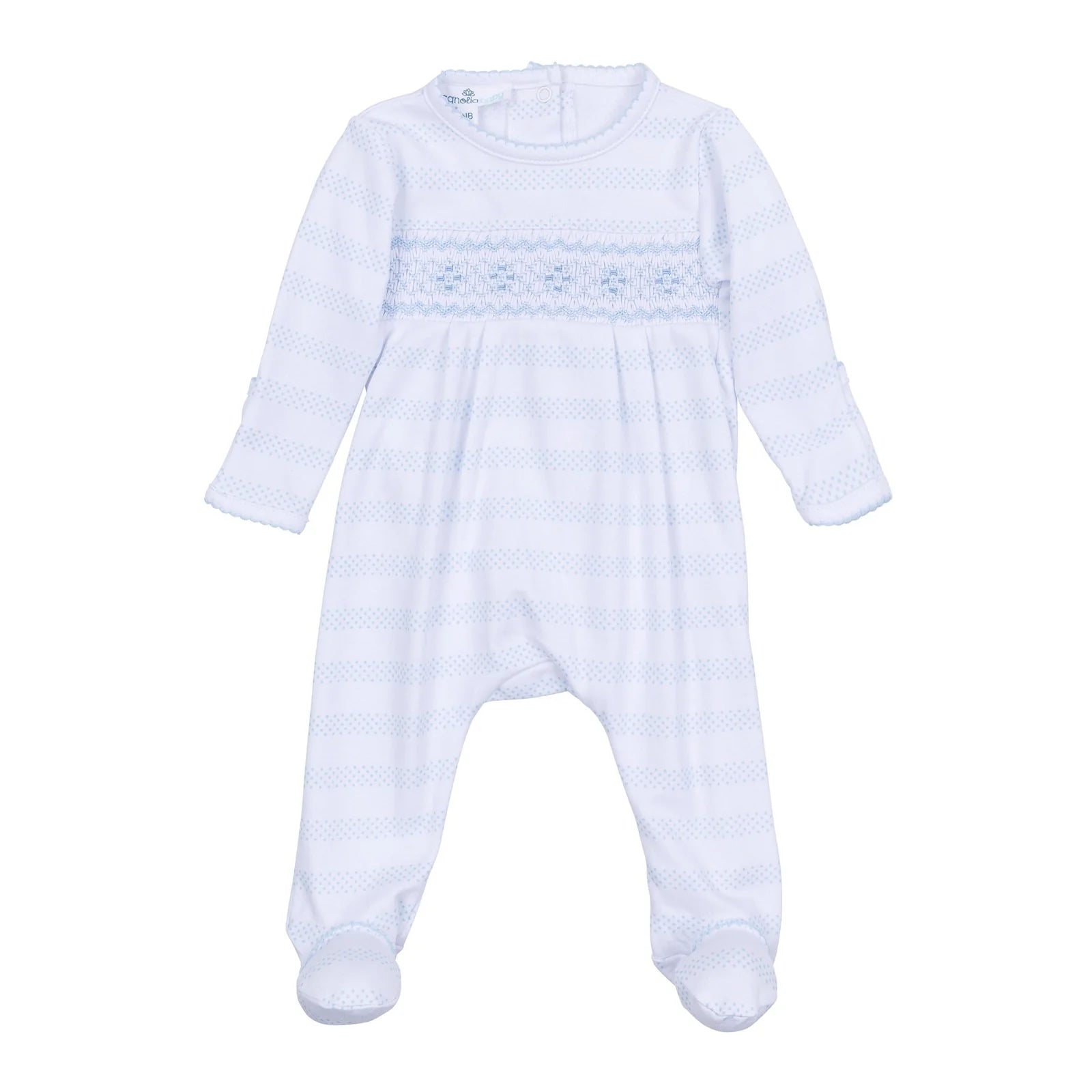 Woven from the most exquisite Pima Cotton, this light blue smocked footie from our Baby of Mine collection offers tender comfort and a touch of classic charm. Delicate light blue picot trim edges the neckline and cuffs, complemented by a subtle stripe made of points in matching light blue, just above the lovely smocked detail.