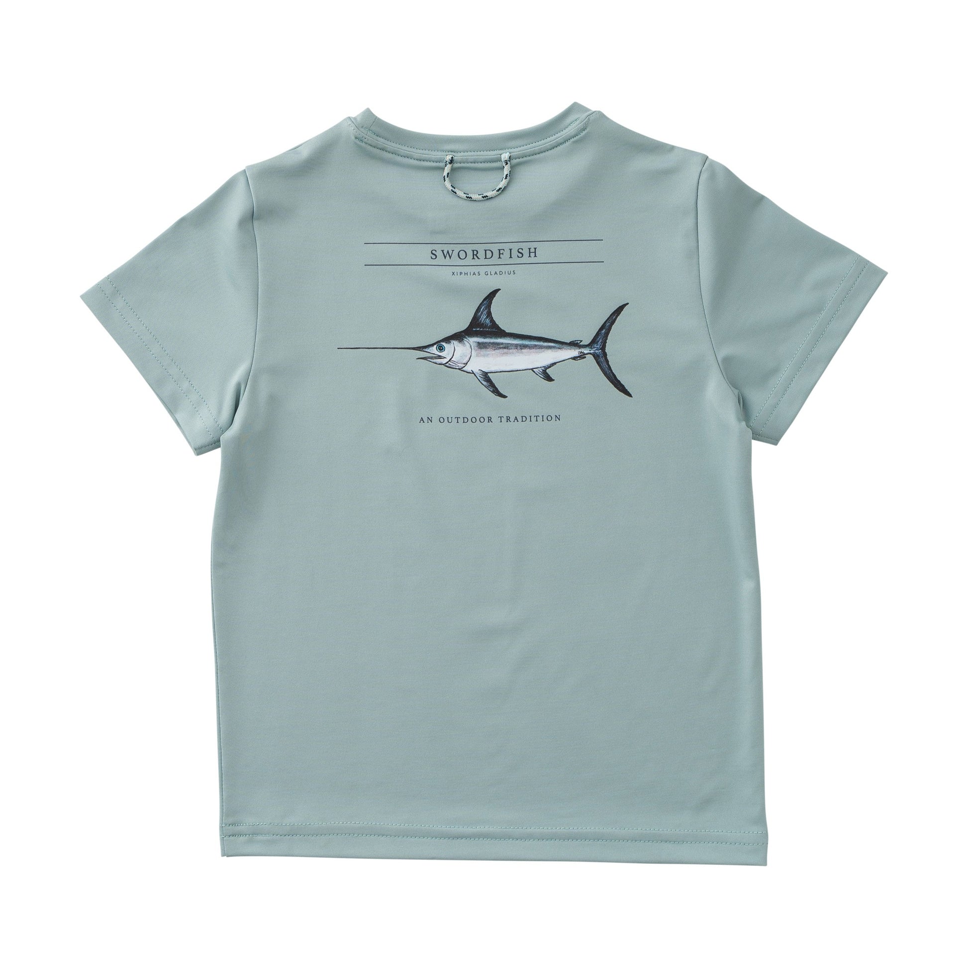 Reel in adventure with this PRODOH Kid's Pro Performance Short Sleeve T-shirt in Blue Surf with Swordfish. Designed for kids who love to explore the outdoors in comfort and style. The Swordfish graphic brings ocean inspiration to every backyard, boat trip, or beach day. This minty green tee pairs perfectly with any Outrigger Short or Original Angler Pant.